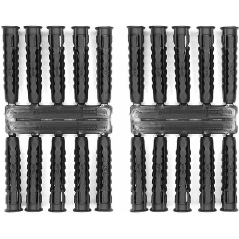 20x Cheville universelle à collerette ; Matière = Plastique ; Couleur = Noir ; Diamètre = 6mm ; Longueur = 30mm ; Pour vis de diamètre 4 – 5mm ; Se noue dans les matériaux creux et se dilate dans les matériaux solides ; Haute résistance au dénudage