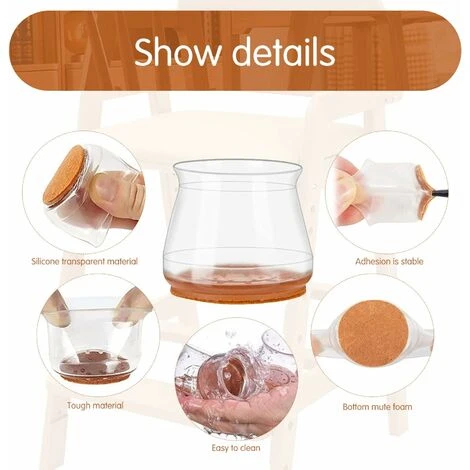 1.Bon matériau : notre capuchon de chaise est composé de deux matériaux, silicone et feutre, la partie supérieure est en silicone transparent et la partie inférieure est en feutre marron, qui est résistant à l’usure et élastique, et peut être utilisé pendant une longue période.