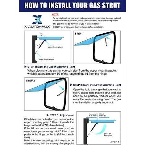 Remarque: ne les comprimez pas à la main avant l’installation, les jambes de force ne peuvent être que compressées. après l’installation avec succès.Après l’installation, le couvercle/couvercle serait ouvert ou fermé en douceur.Température de fonctionnement: -25degrés Celsius à 70degrés Celsius.