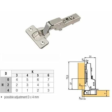 2x Charnière invisible avec angle d’ouverture à 110° ; Charnière à clipser dans l’embase ; Sans embase / plaque (Plaque H0 recommandée) ; Sans amortissement ; Pour une pose semi-applique / jumelée (demi-recouvrement) ; Boîtier à visser (vis non incluses) ; Entraxe boîtier = 45mm ; Haute qualité pour une longue durée de vie