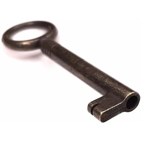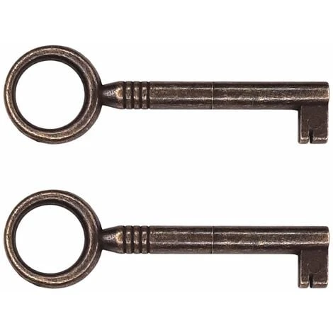 Lot de 2 clés de remplacement pour meuble ancien, rustique ; Convient pour les meubles, les commodes, les tiroirs, les penderies ; Longueur totale : 70 mm ; Diamètre alésage = 4 mm ; Diamètre extérieur = 6 mm ; Produit neuf (Zamak), finition brunie ; Sélectionné pour vous, clé décorative et design parfaite pour rénover vos meubles anciens ;