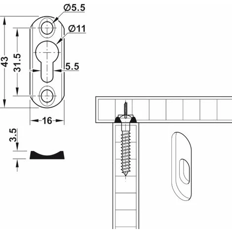 Lot de deux plaques à tête bombée pour pose mécanique universelle ; Pour tête de vis = 10mm ; Pour diamètre de vis = 5mm ; Hauteur = 43mm ; Idéal ferrure de fixation étagère, meuble capitonné, lit, tableau ; Acier brut ;