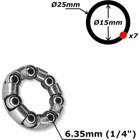 2x roulement de type cage à billes en acier ; Diamètre intérieur = 15mm ; Diamètre extérieur = 25mm ; Nombre de billes = 7 ; Diamètre des billes = 6,35mm ; Utilisation universelle, éléments roulants, vélo, bricolage.