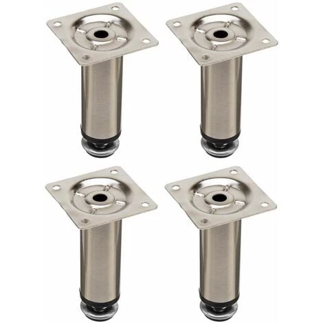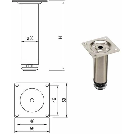 4x Pied de meuble ; En acier ; Finition chrome poli ; Diamètre du pied = 30mm ; Dimensions de la base à visser = 59 x 59mm ; Entraxe = 46mm ; Diamètre des trous pour le perçage = 4mm ; Hauteur totale H = 100mm ; Ajustable jusqu’à + 13mm ; Capacité de charge = 20 – 25kg ; A visser (Vis non inclues)