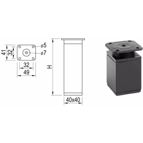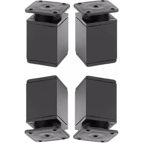 4x Pied de meuble ; Forme = Carré ; Matière = Plastique ; Finition = Noir mat ; Dimensions = 40 x 40mm ; Hauteur H = 60mm (ajustable jusqu’à + 15mm) ; Capacité de charge = 40kg ; A visser (vis non incluses)