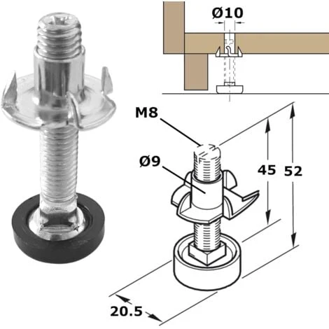 Vis de réglage ajustable pour meubles, outillages ; Le kit comprend 4 vis de réglage M8 et 4 écrous à griffe M8 ; Capacité de charge : 300Kg (statique) ; Empreinte PZ2 (tête de vis) et clé carré SW8 (base de vis) ; Nous conseillons de percer votre trou de montage à 10mm de diamètre ;