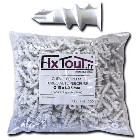 500 chevilles P.O.M turbo autoperceuses D. 13 x L. 33 mm – spécial plaque de plâtre – Fixtout