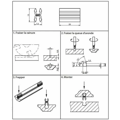 6x Système de fixation à queue d’aronde ; Emboîtement double dans les rainures en forme de queue d’aronde ; Invisible, auto-serrant, simple (emboîtement par clipsage de face) et démontable ; Dimensions = 13 x 7,3 x 20mm ; Idéal pour la fixation de pièces de petites dimensions ou de panneaux de faibles épaisseurs ; Gain de temps = Immédiatement résistant