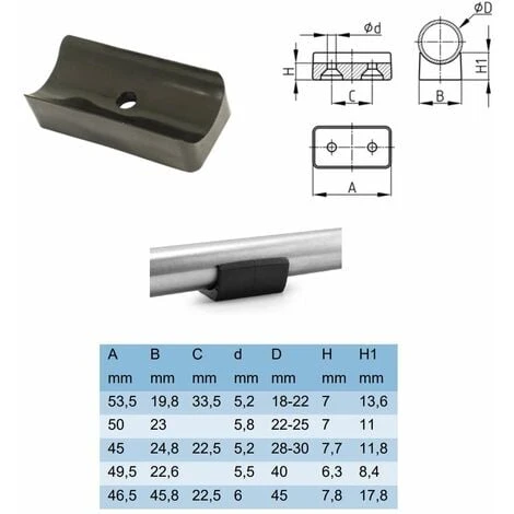 8x Embout / Patin pour pied de chaise type Cantilever ; Matière = Plastique ; Couleur = Noir ; Diamètre de tube D = 22 – 25mm ; Longueur A = 50mm ; Largeur B = 23mm ; Hauteur totale H1 = 11mm ; A visser à l’aide d’un trou de diamètre d 5,8mm (Vis non incluse) ; Idéal pour protéger les sols, parquets …