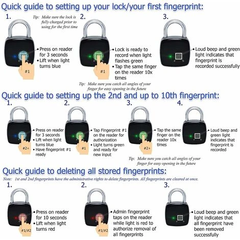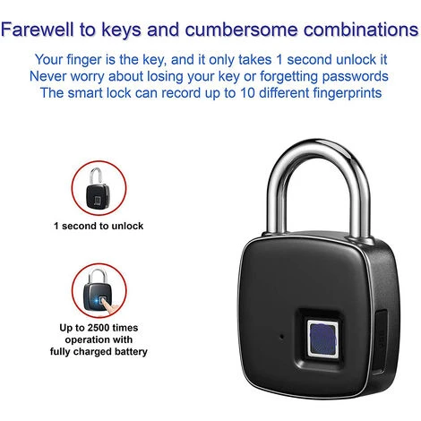 Description du produit 1.【Cadenas intelligent】Cadenas à empreintes digitales robuste, plus besoin de s’inquiéter de perdre des clés ou d’oublier des mots de passe car votre doigt est la clé et le mot de passe. Ce cadenas nouvellement conçu avec détection d’empreintes digitales peut améliorer la sécurité de vos portes, vélos, armoires, entrepôts, etc. grâce à l’identification biométrique des empreintes digitales. 2. 【Déverrouillage de l’application mobile】 Le cadenas d’empreintes digitales IP65 étanche pour l’extérieur Bluetooth prend en charge un contrôle d’application mobile GRATUIT, le cadenas peut être déverrouillé via l’application mobile ou vos doigts. Vous pouvez ajouter d’innombrables utilisateurs et définir leur période de déverrouillage pour les amis, les voisins, le personnel, vérifier les enregistrements/position de déverrouillage et déverrouiller l’appareil via l’APP à distance. 3. 【Déverrouillage tactile par empreinte digitale】 Ce cadenas sans clé prend en charge 15 empreintes digitales, vous pouvez définir tous les utilisateurs d’empreintes digitales via l’application mobile, seuls les administrateurs peuvent réinitialiser le cadenas intelligent en mode usine. 4. 【Chargement USB】 La batterie intégrée de 220 mAh du cadenas à empreintes digitales a une consommation d’énergie inférieure et une longue durée de veille, a plus de 6 mois de temps de veille. Vous pouvez charger la serrure avec une banque d’alimentation, un port USB depuis votre ordinateur portable ou tout autre bloc de charge de téléphone portable. 5.【Protection à toute épreuve】 Le corps du cadenas est fabriqué dans un matériau de haute qualité. Le cadenas à empreintes digitales est idéal pour une utilisation en extérieur, les portes de jardin, les portes de ferme, les casiers scolaires, les clôtures, les armoires, les boîtes à outils, les boîtes à matériel de pêche, les entrepôts, les vélos, etc.
