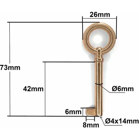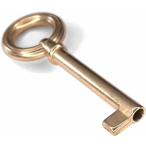 Clé de remplacement pour meuble Art déco ; Convient pour les meubles, les commodes, les tiroirs, les penderies ; Longueur totale : 73mm ; Dimensions complètes en photo 3 ; Produit neuf en laiton véritable, finition poli et verni ;