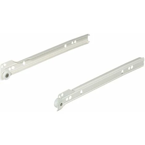 Paire de coulisses à galets BLUM Metabox C15 (gauche et droite) ; Matière = Acier ; Finition = Plastifié blanc crème RAL 9001 ; Avec fermeture automatique par traction ; Longueur nominale = 350mm ; Sortie partielle 283mm ; Capacité de charge = 25kg / paire