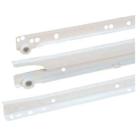 Coulisses de tiroir à galets silencieux, fixation sous tiroir. Sortie totale. Décor blanc.
