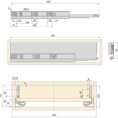 - Kit de ferrures nécessarie pour le montage d’un tiroir, hauteur 93 mm et profondeur de 500 mm, à l’exception de la face avant du tiroir, en modules d’une largeur de 450 mm et d’une épaisseur de côté de 16 mm.