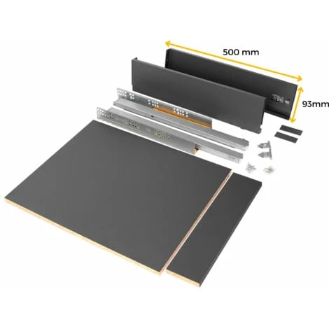 Kit pour tiroir de cuisine et salle de bain avec tous les éléments nécessaires à son montage. C’est la solution optimale pour vos meubles de cuisine, de salle de bain ou d’armoire avec un design élégant en gris anthracite et blanc. Chaque kit est composé de tous les éléments nécessaires au montage d’un tiroir extérieur de hauteur 93 mm et d’une profondeur de 500 mm avec différentes largeurs de modules. Comprend: deux côtés latérales, un ensemble de guides à fermeture amortie, un ensemble de couvre-garnitures, des panneaux inférieur et arrière et des attaches avant de tiroir. Vous aurez simplement besoin du panneau avant avec les dimensions nécessaires du tiroir.
