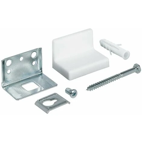 Equerre d’assemblage pour élément haut ; Matière = Acier ; Avec cache en plastique blanc ; Capacité de charge = 150kg ; Dimensions (avec cache) = 56 x 35mm ; Réglage confortable des vis grâce à l’inclinaison possible du tournevis ± 15° ; Possibilité de réglage = Latéral 8mm et Hauteur 8mm ; A visser (vis et cheville incluses)