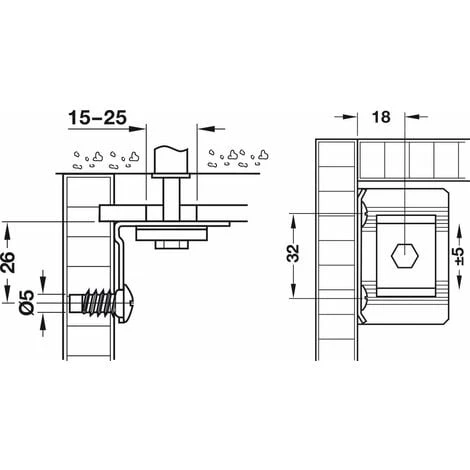 Equerre d’assemblage pour élément haut ; Matière = Acier ; Avec cache en plastique marron ; Capacité de charge = 150kg ; Dimensions (avec cache) = 56 x 35mm ; Réglage confortable des vis grâce à l’inclinaison possible du tournevis ± 15° ; Possibilité de réglage = Latéral 8mm et Hauteur 8mm ; A visser (vis et cheville incluses)