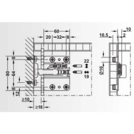 Ferrure de suspension de meuble ; Par paire (1 gauche L et 1 droite R) ; Matière = Acier ; Finition = Zingué ; Capacité de charge = 120kg par paire (résultat d’essais réalisés selon les normes DIN EN 14749, DIN EN 14688 et DIN ISO 7170) ; Possibilités de réglage = 22mm en hauteur et 19mm en profondeur ; A ajuster uniquement avec un tournevis manuel