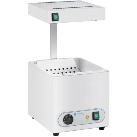 Avec ce chauffe-frites, vous pouvez, sur une longue durée, maintenir au chaud des frites et d’autres aliments frits, tels que des snacks, le tout sans courir le risque de faire brûler quoique ce soit. L’appareil qui maintient au chaud dispose d’une molette grâce à laquelle vous pouvez programmer de manière exacte n’importe quelle température entre 30 et 90 °C. Cette large fourchette vous permet de choisir avec précision la température dont vous avez besoin pour réchauffer vos aliments. La réserve à frites atteint une puissance totale de 850 Watt. Dans la partie inférieure du bac à frites, se trouve une plaque chauffante à 350 Watt, qui peut être réglée de manière précise à la température souhaitée. Parallèlement, la rampe chauffante comporte un deuxième élément chauffant d’une puissance de 500 Watt, lequel maintient vos snacks à la température nécessaire depuis en-haut.
