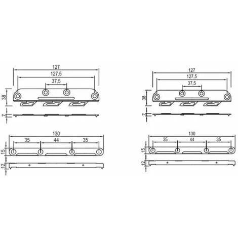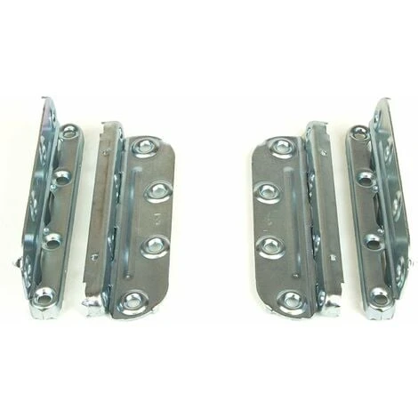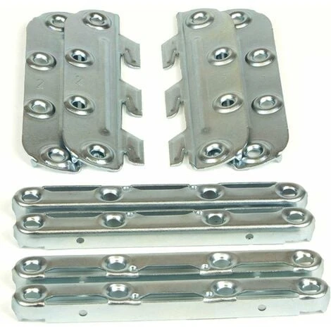 Ferrures d’assemblage permettant la fixation des rails latéraux à la tête et au pied de lit ; 4 mâles (2 gauche et 2 droite) avec des dents pour tenir fermement et 4 femelles ; Longueur = 130mm ; Matière = Acier galvanisé ; A visser (vis non incluses) ; L’ensemble contient un raccord pour un lit