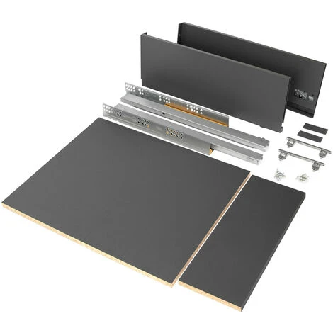 Kit pour tiroir de cuisine et salle de bain avec tous les éléments nécessaires à son montage. C’est la solution optimale pour vos meubles de cuisine, de salle de bain ou d’armoire avec un design élégant en gris anthracite et blanc. Chaque kit est composé de tous les éléments nécessaires au montage d’un tiroir extérieur de hauteur 178 mm et d’une profondeur de 500 mm avec différentes largeurs de modules. Comprend: deux côtés latérales, un ensemble de guides à fermeture amortie, un ensemble de couvre-garnitures, des panneaux inférieur et arrière et des attaches avant de tiroir. Vous aurez simplement besoin du panneau avant avec les dimensions nécessaires du tiroir.