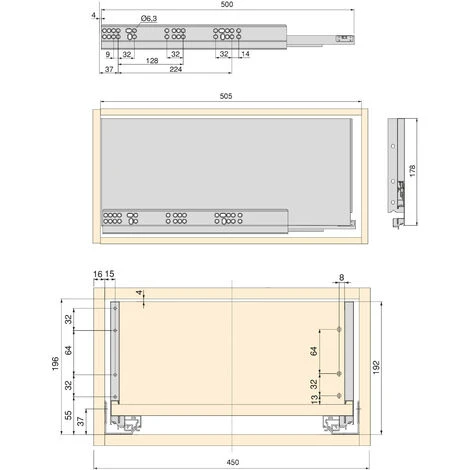 - Kit de ferrures nécessarie pour le montage d’un tiroir, hauteur 178 mm et profondeur de 500 mm, à l’exception de la face avant du tiroir, en modules d’une largeur de 450 mm et d’une épaisseur de côté de 16 mm.