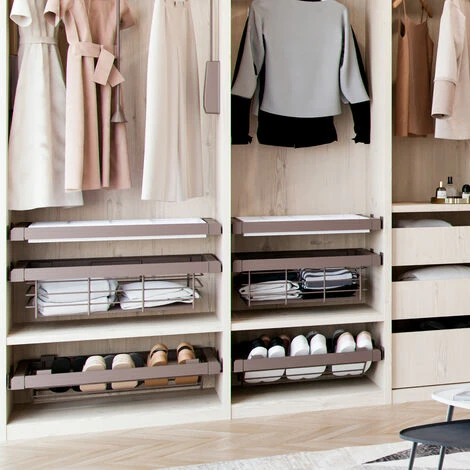 Le Kit contient un tiroir organisateur et un cadre coulissant réglable pour l’adapter à l’intérieur de l’armoire. La structure est équipée avec des coulisses invisibles à sortie totale et fermeture amortie, et d’un système de clipsage automatique et rapide pour son installation. Le cadre est fabriqué en aluminium finition couleur moka et le tiroir en bois avec compartiments intérieurs.