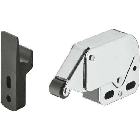 La fonction d’ouverture est activée par une légère pression sur la porte ; Matière = Fermeture en acier et contre-pièce en plastique noir ; A visser ; Ouverture de la porte par légère pression sur la façade : la porte s’ouvre automatiquement / Ouverture et fermeture par légère pression sur la façade