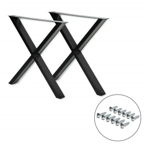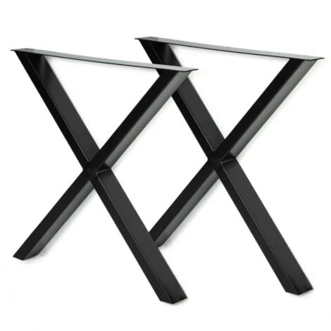Laissez libre cours à votre créativité et fabriquez vous-même vos propres meubles tendances !Grâce à ce lot de 2 pieds de table forme X en métal noir mat ultra robuste Hauteur 73 cm (avec les patins), customisez et réinventez vos vieux meubles. Ce set de 2 pieds apportera une nouvelle vie à votre table à manger avec un design industriel moderne ultra-tendance.Faites de votre meuble un objet unique et personnalisé ! C’est désormais facile de fabriquer votre propre table de salle à manger ou votre bureau. Leur design en forme de X leur confère stabilité et robustesse. Chaque pied supporte jusqu’à 50 kg environ.Dimensions des pieds forme XMontage facile : grâce à la plaque de fixation, les pieds se fixent simplement au plateau du meuble (non fourni) : 6 vis fournies par pied soit 12 vis au total.4 patins anti-dérapants par piedLongueur d’un pied : 69 cm en bas, 72 cm pour le support destiné à fixer le plateauLargeur d’un pied : 7,5 cmHauteur d’un pied : 73 cm avec patins (72,5 cm sans les patins)Matériau : métal 1,2 cmA monter soi-mêmeDonnez du style à votre intérieur !Réalisez tous vos projets sur mesure avec nos lots de pieds design industriel