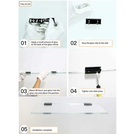 Facile à installer : pas besoin de percer le verre, il suffit de fixer le clip sur le mur, de mettre le verre à l’intérieur et de le visser, très facile et rapide à installer.
