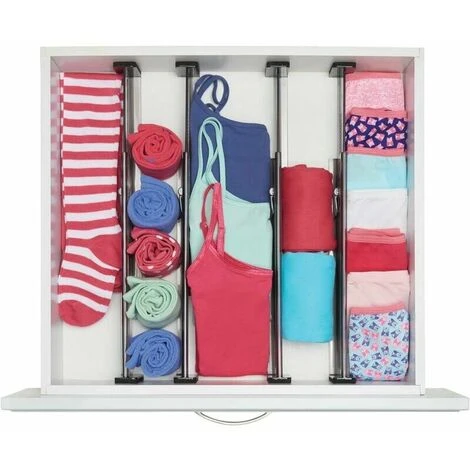 INSTALLATION FLEXIBLE : Le séparateur sintègre dans importe quelle commode ou armoire de cuisine. Pour assembler, il suffit de soulever, ajuster la longueur et de baisser.