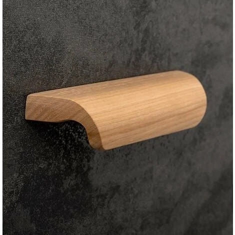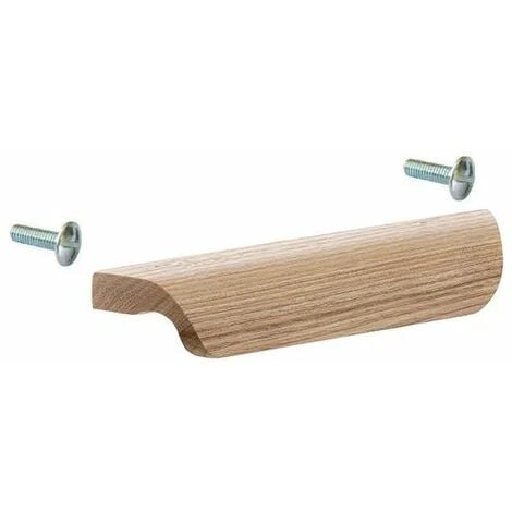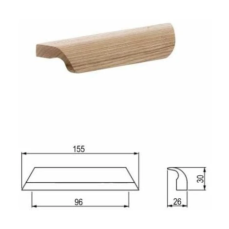 Poignée de meuble ; Matière = Bois ; Finition = Chêne laqué ; Entraxe = 96mm ; Longueur totale = 155mm ; Hauteur = 30mm ; Largeur = 26mm ; Avec vis de serrage inclues