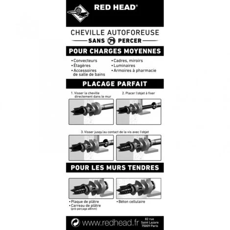 - Plus Produit: Pas de perçage préalable (la cheville en forme de pointe fore la plaque de plâtre), blocage en fin de vissage