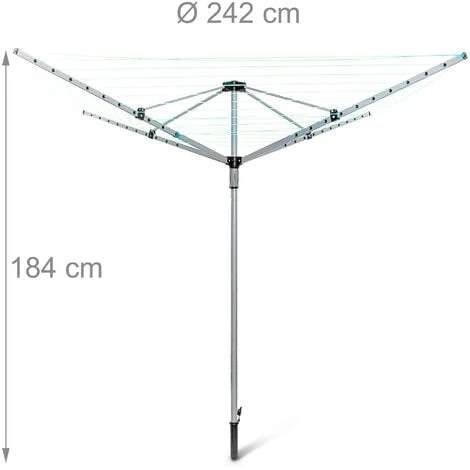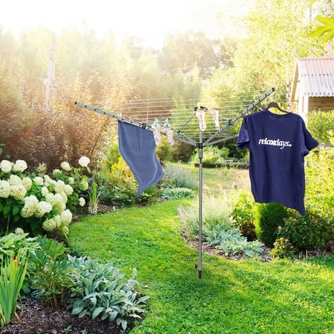 Ce séchoir à linge parapluie robuste avec 11 niveaux et 4 côtés, conçu pour être utilisé dans le jardin, a une corde à linge d’environ 49,2 m et peut accueillir des vêtements de différentes tailles. La corde à linge pratique est particulièrement résistante à la déchirure et à l’usure et est bien visible. Il y a 2 porte-cintres sous forme de trous sur chacun des 4 bras. Les chemises et les chemisiers peuvent y être accrochés.