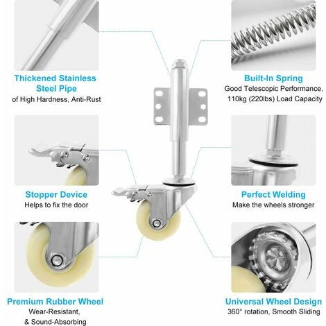 ROULETTE ROBUSTE AVEC DISPOSITIF D’ARRÊT – La roue a une capacité de charge maximale de 220 lb et peut également résister à l’exposition aux produits chimiques et aux solvants. Système de fixation universel pour portails en bois ou en métal. Le dispositif d’arrêt aide à fixer la porte. La capacité de charge du ressort est de 60 kg/132 lb. Lorsque le poids de la porte est supérieur à 60 kg/132 lb, le ressort perd son élasticité.