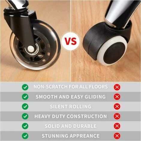 pour vos sols. Les roues laissent à peine des rayures sur le sol, parfaites pour les sols en carrelage, parquet, stratifié, bois, marbre, granit, pierre, béton ou vinyle.3.[Silencieux, Robuste] Les roulettes de chaise en polyuréthane résistant à l’usure