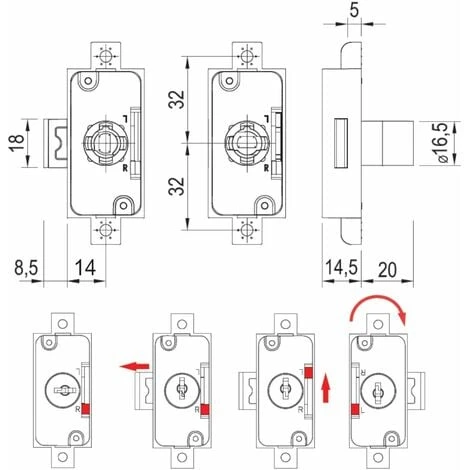 Serrure espagnolette avec clés de remplacement et rosace pour meuble, armoire, buffet ; Serrure reversible, la serrure peut se monter à gauche ou à droite ; Entraxe de fixation : 64 mm ; Largeur de boîtier : 28 mm ; Epaisseur de boîtier : 14,5 mm ; Hauteur de boîtier : 55 mm ; Vendu avec un jeu de deux clés, une rosace et les vis de fixation ;