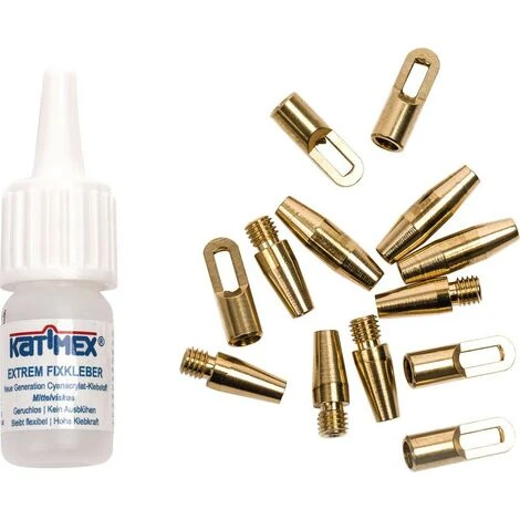 Service-Set zur Bandreparatur, bestehend aus 5 Anfangshülsen, 5 Zugköpfen mit Zugöse Ø 6 mm, 3 Verbindungshülsen, 1 Spezialkleber 3 g und Anleitung.
