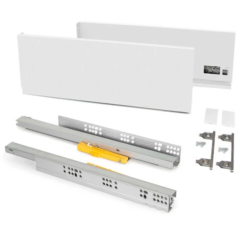 - Kit de quincaillerie nécessaire au montage d’un tiroir Push Synchro de hauteur 178 mm et de profondeur 450 mm, à l’exception du bord, du dos et du fond.