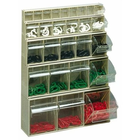Bloc en polystyrène beige composé de tiroirs translucides basculants et amovibles. Une tringle de sécurité (en option) permet de bloquer l’ouverture des tiroirs. Les blocs peuvent être fixés au mur ou empilés, butées de calage pour superposition. Tiroirs translucides, contenu immédiatement identifiable. Porte-étiquette. Livré nu.